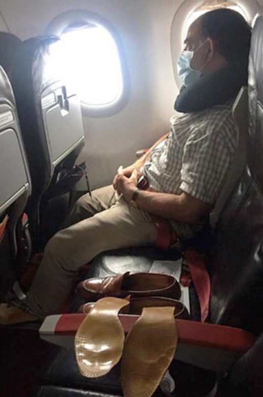 With two vacant seats on either side, it is a mystery as to why this passenger chose to lay his insoles on the arm rest, reaching into the aisle. In fact, it is a mystery as to why the insoles are even out of the shoes, and as to why the shoes are even on the seat.