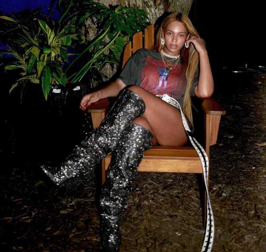 Queen Bey posted up with her hubby JAY-Z to show off her sexy thighs in some thigh-high boots and short-shorts.